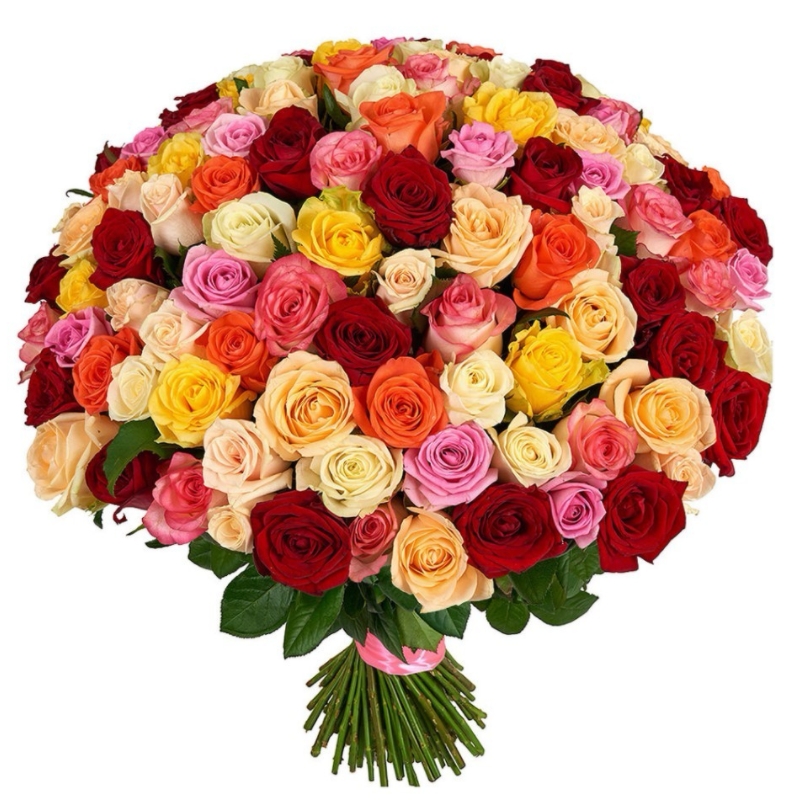 Букет состоит из MIX из 101 белой / желтой / красной / розовой / коралловой и малиновой розы, прозрачная упаковка, атласная лента.